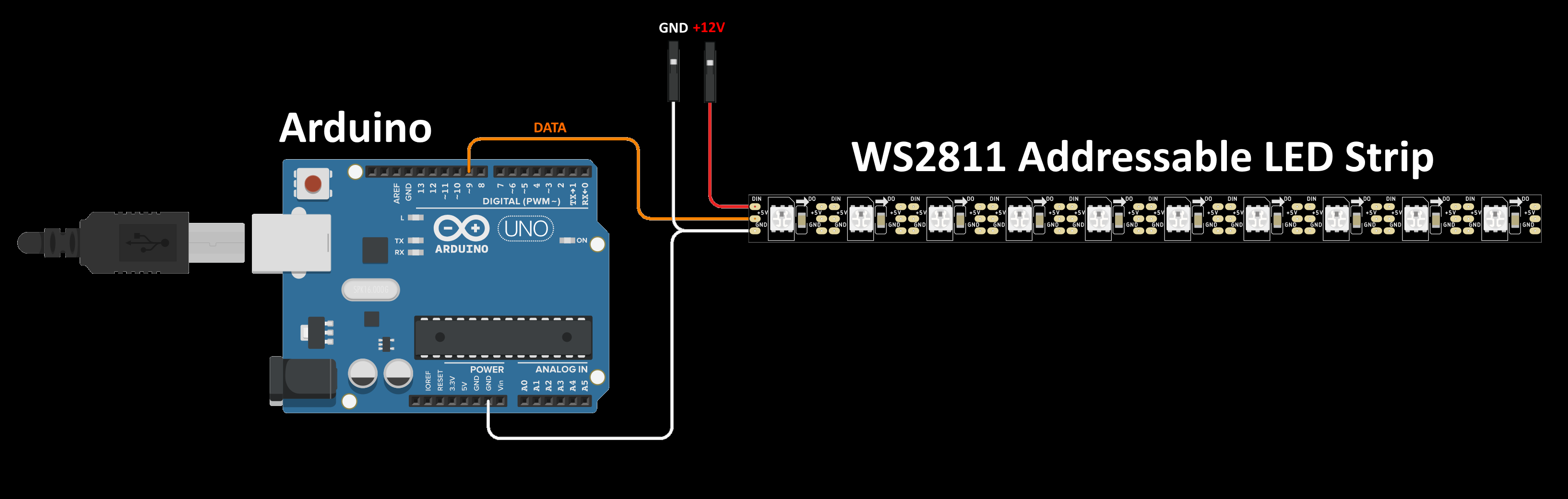 The first thing to do is to build the circuit that will drive the led strip. Since this is an addressable LED strip, it does not require the use of external components and to make it work it will be sufficient to connect the DATA connector with any pin of the arduino and then the power supply directly on the VCC and GND pins of the strip. The circuit to be built is shown in the image below: