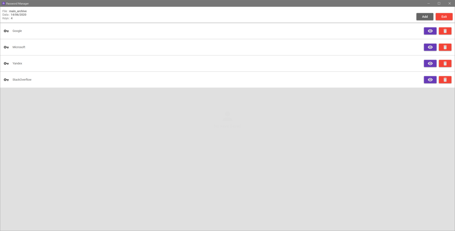 Password Manager is a software that allows easy control and saving of all the passwords of the various accounts in an easy and secure way, without the use of external clouds. All passwords will in fact be saved to a file (.pskm) encrypted.